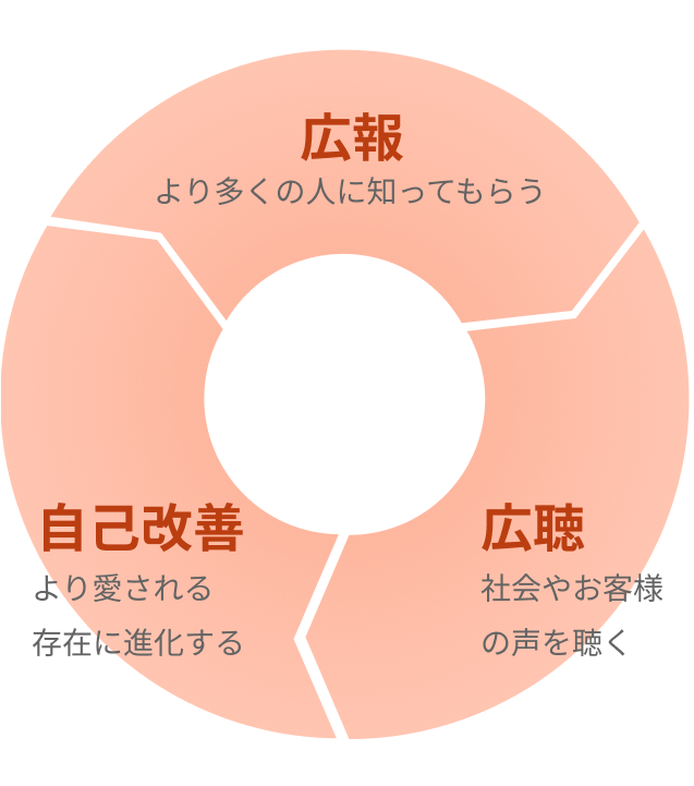 そんな時PR担当者は、幅広い意見や声を聞き(広聴)、それらを社内に適切にフィードバックします。そして、企業やブランドがより社会に受け入れられ、信頼される存在へと進化していくために働きかけます。(自己改善)。